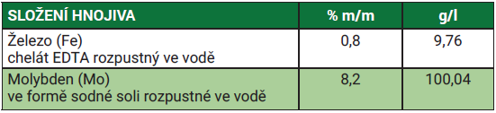Cropvit FeMo je tekuté dvousložkové listové hnojivo určené k výživě plodin citlivých na nedostatek železa a molybdenu.